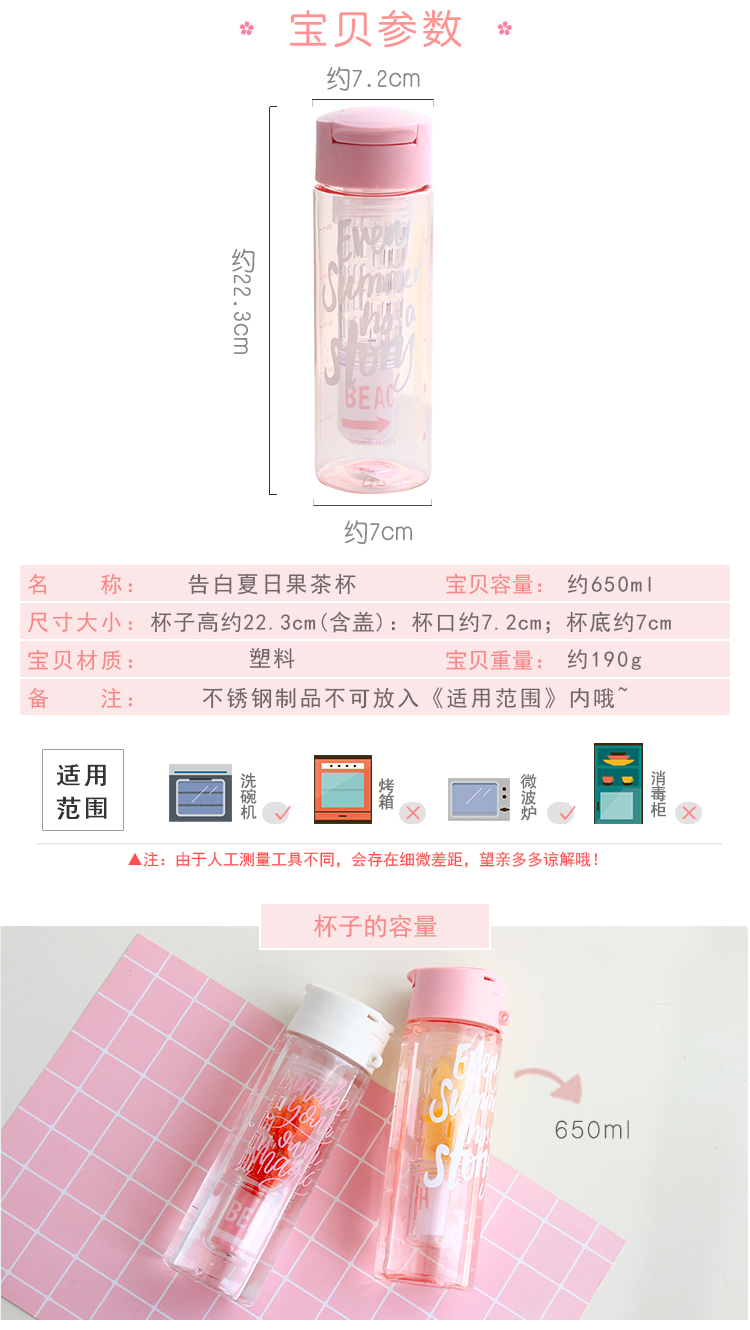 產(chǎn)品特點(diǎn):食品級(jí)材質(zhì),攜帶方便,杯口圓滑,650ML容量,一款滿滿少女心的隨手杯