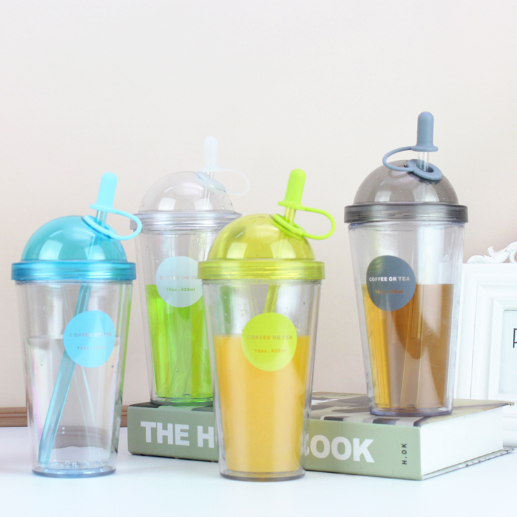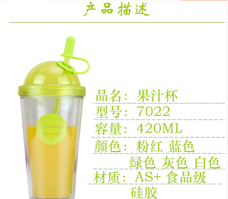 產品特點:AS食品級材質,420M容量,多種顏色選擇,雙層果汁杯、牛奶杯